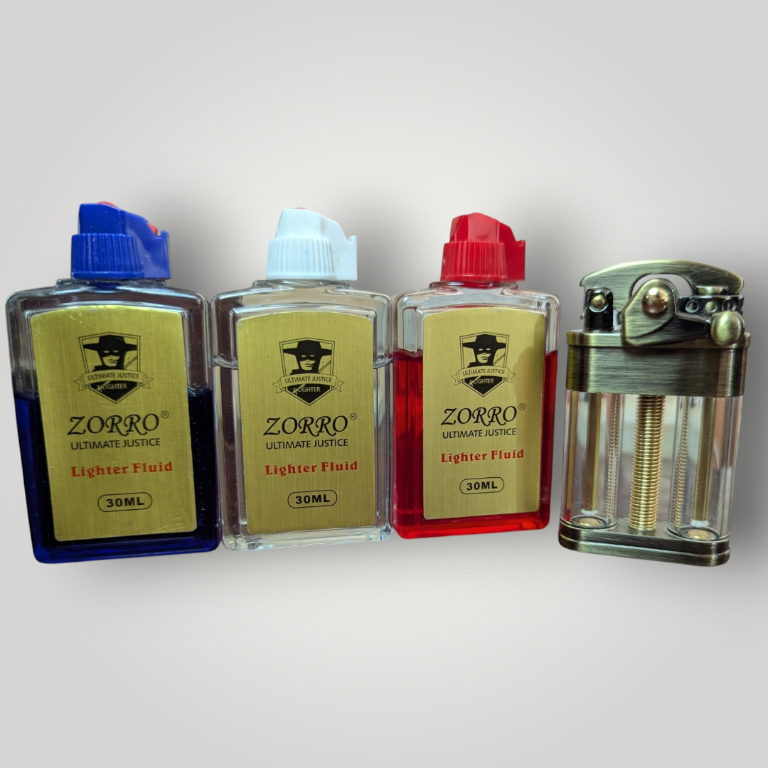 The Zorro Multi Color Oil Lighter features a transparent body that allows you to monitor fuel levels easily. Available in red, blue, and clear oil variants, it ignites smoothly with a stylish flick mechanism, combining functionality with sleek design. Ideal for reliable and precise lighting needs.